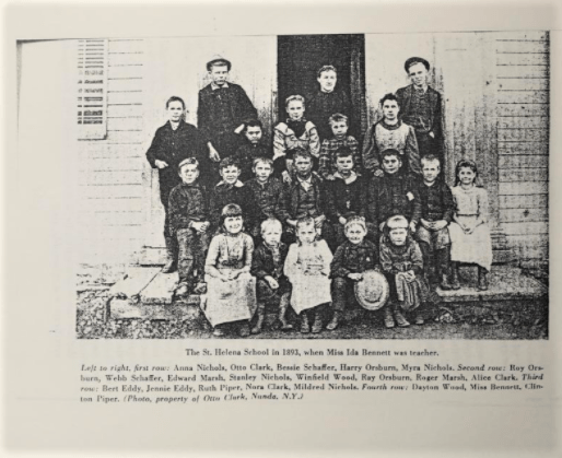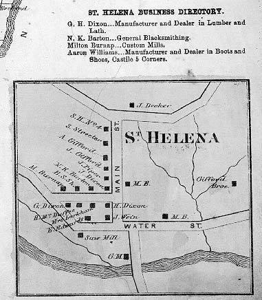 By the 1850s when the Genesee Valley Canal was in business, there were now several saw mills and a grist mill. It also boasted two general stores, a hotel, a blacksmith shop, woodworking shop, a cider mill, and schoolhouse. There were approximately 25 residences at that time. New York State dredged the river from St. Helena to York Landing to facilitate St. Helena and Gibsonville in using the canal to ship their goods of wheat, flour, logs, staves, tan bark, and whisky. The future looked bright for the river towns, but it quickly evaporated when the Civil War began. The first post office was established in 1854 and closed in June 1867. It briefly reopened in February 1897, but was shutdown on June 2, 1897. From then on the mail was delivered by the post office in Castile.