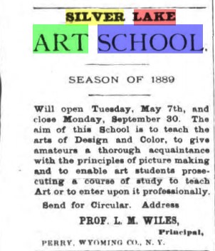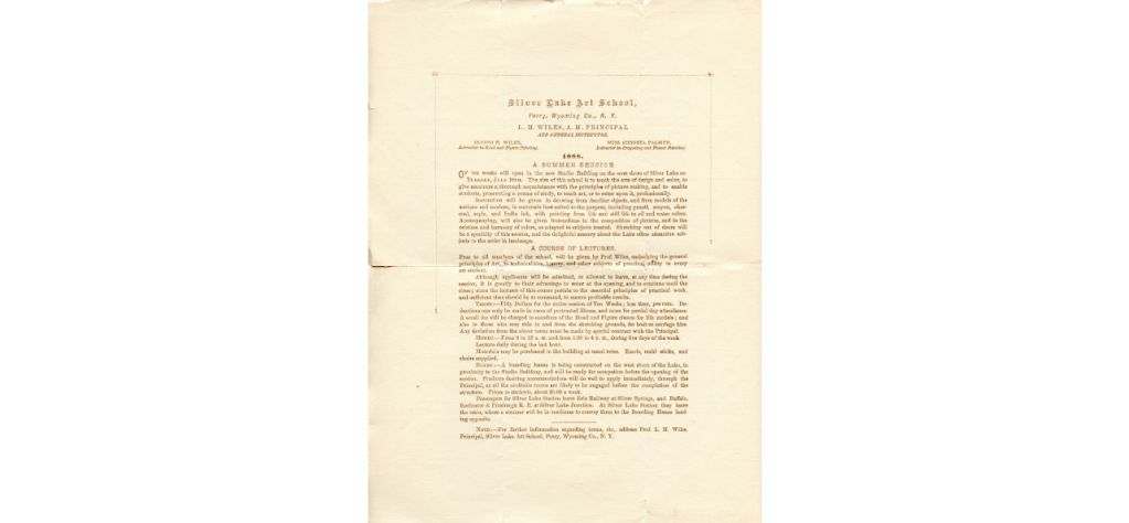 The art school flourished, and many pupils at Ingham went on to have successful art careers. But in 1888, everything changed. The trustees of the university became unhappy with the monetary arrangement with Wiles. He had been allowed to keep the profits from the art school, which averaged about $800 per year. The trustees decided to charge Wiles the amount of the profits as rent for his studio, which was the breaking point for Lemuel. Since he didn’t receive a salary from the university, the profits were his only remuneration. With great sadness, he left Ingham in 1888 and focused his efforts on establishing Silver Lake Art School.