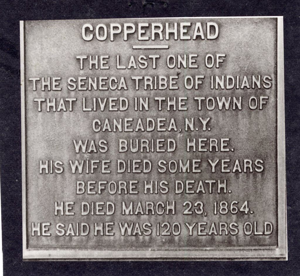 A boulder on the Houghton University campus (formerly Houghton College) marks the final resting place of one of the Genesee’s legends, Copperhead. His identity was also disputed at one time, lending some mystery to this man who lived in the Houghton area for most of his life, but that has been resolved. To understand why Copperhead is important to Genesee Valley history, we need to back up to the Revolutionary War when the Senecas were part of the native coalition that supported the British army. General George Washington sent General John Sullivan and General James Clinton to carry out a brutal retaliation against the Iroquois Confederacy, which had carried out a scorched-earth campaign against the pioneer settlements of New York and Pennsylvania. The governor of New York begged Washington to send troops to save Americans, believing they would be wiped out if the Confederacy wasn’t stopped. Washington committed a quarter of the Continental Army to the campaign, which accomplished its mission in 1779 by destroying over 40 Native American villages and the inhabitants, vast quantities of corn, and other food supplies, driving survivors to the British stronghold, Fort Niagara, for protection. The Six-Nations Confederacy never recovered, and in 1797, Seneca chiefs signed the Treaty of Big Tree, selling over 3.5 million acres of the Genesee River Valley Region and land further west to the United States. The famous chiefs of the Senecas, Cornplanter, Red Jacket, Tall Chief, and Little Beard were among those who signed the treaty near Geneseo, New York. This event was also when Mary Jemison, the White Woman of the Genesee, received the Gardeau property. The Senecas kept tracts of land for themselves as reservations, and one of those was the Caneadea Reservation. It was a parcel two miles wide and eight miles long that began at the mouth of the Wiscoy Creek in the Town of Hume and continued along the Genesee River to Sand Hill Road and NYS Route 19.
