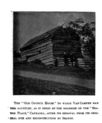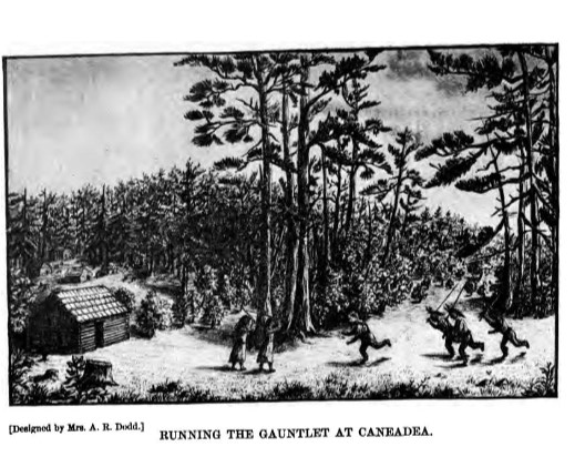 He fully understood that if this man said anything about the incident, he would be tortured and killed without delay. The man was Horatio Jones, another captive who acted as an interpreter for the Senecas. Jones told him he would be safe if he could make it to Fort Niagara without revealing his identity, but until then, it must be kept secret. Jones then warned the men under Van Campen to keep from revealing who their captain was. The march resumed, and the party reached the Genesee River, where they continued until they reached Caneadea. This was a large Seneca town, and the warriors whooped greetings as they neared the log cabins, smoke from the chimneys wafting skyward. The people flocked to congratulate the successful men, look at the prisoners, and loot. They were eager to test the prisoners by forcing them to run a gauntlet of about 165 yards to see what these men were made of.