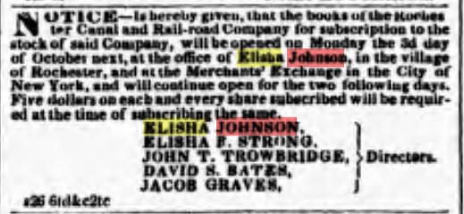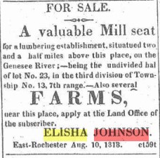 When the Genesee River Valley opened for settlement in the early 1800s, it was driven primarily by the Holland Land Company, a group of Dutch investors and banks. Ambitious men of all types poured into the area, planning to make their fortunes when they saw the rich resources along the river. One of these men was Elisha Johnson who would not only be a perennial politician in Rochester but was also responsible for building significant infrastructure for the Genesee Country. For readers who own property in Allegany, Livingston, or Wyoming Counties, a quick perusal of your deed will show Elisha Johnson as the man who subdivided the Cottringer Tract in 1807, a piece of land that straddled the winding Genesee River.