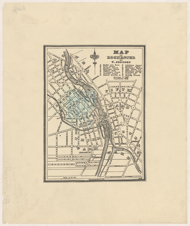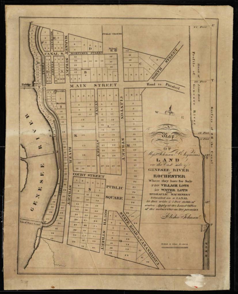Upon his arrival in the frontier village of Rochester, he immediately negotiated the purchase of 80 acres of land from Enos Stone, a farmer whose farm was in the center of Rochester, and his acreage followed the east side of the Genesee River. The price tag was steep–$10,000 for the prime acreage, and Johnson immediately began the work of surveying to create building lots, selling them to the stream of pioneers headed west. Mills for both timber and flour were always an immediate need for any new village, and he also began the construction of a dam near the present Court Street Bridge. He then proceeded to dig a mill canal from there to Main Street, securing the water power needed by the mills. He partnered with Orson Seymour and several others to provide power to various lumber and flour mills in the growing village. The project’s final cost was $12,000 (almost $300k today), quickly proving profitable for the men. The blasting of the millrace/canal was coordinated with the 4th of July celebration in 1817, which was recorded in the memoirs of Edwin Scranton, an early Rochester resident.