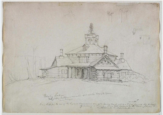 The engineer was taken with the beauty of the river gorge, and anticipating the project would take a long time, he decided to build a home for his family near the project in 1840. That way, he could easily walk to work and wouldn’t be separated from his family for long periods. Inspiration for what would be named Hornby Lodge likely came from the politics of the day—“Tippee Canoe and Tyler Too.” Log cabins, raccoons, and hard cider were all part of the lyrics of a campaign song for the Whigs that year, so Johnson (a Whig) drew up plans for an exceptionally grand log cabin. It was built on an outcropping of rock overlooking the river gorge while the tunnel work progressed underneath the house.
