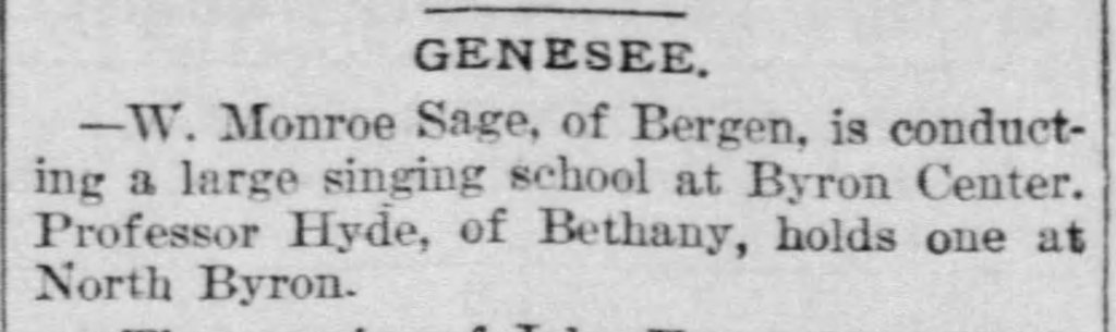 Early in the 19th century, as villages dotted the landscape along the Genesee River and Western New York, churches sprang up, and residents organized according to Protestant doctrinal persuasions—Presbyterian, Baptist, Congregational, and Methodist-Episcopal. The preachers regularly came along, but musicians were scarce, as were musical instruments and printed music. This unsurprisingly led to dismal singing in the small congregations. Some congregants may have had an old family hymnal, but words were merely printed in them and were without musical notation. For that, a separate tune book was needed, and the tunes had names such as Regent Square, Lancashire, St. Dunstain, Winchester, and many more. Selecting the correct tune to go with a hymn for meter was the next challenge and not many had the skills to put the lyrics with the appropriate tune. Some churches had a proficient singer who sang a line from a hymn, which was echoed by the congregation throughout the hymn. This method of antiphonal singing was called “lining,” and eventually, the tune and the words were learned by rote. However, there was a great desire to improve church singing in worship and educate the general population in the rudiments of music. Traveling singing masters came upon the scene and often organized singing schools in a village for a few weeks or months, culminating their work with a concert before going on to a new area.